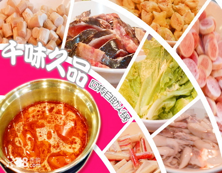 肉類:大蝦、翅根、午餐肉、五花肉、培根、鴨腸、青青腸、鴨胸、魚皮脆、蝦丸、鴨腸、雞胸、紅薯、梭邊魚、平魚、豬腰、魷魚卷、腌羊肉、鯰魚等。另有魷魚、鮮蝦、包心魚丸、撒尿牛丸 、培根、午餐肉、小香腸等,單點牛羊肉125g/10元